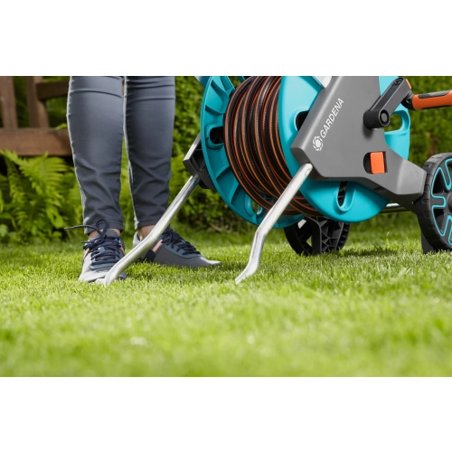 GARDENA AquaRoll M Easy gir deg plassbesparende lagring av hageslangen og er praktisk å bruke. Den ergonomiske sveiven med myke plastkomponenter og den stødige slangeføreren ruller slangen enkelt tilbake. Slangen er allerede utstyrt med Orginale GARDENA systemdeler. Innovativ frostsikkerhet og 5 års garanti garanterer maksimal kvalitet "Made in Germany".